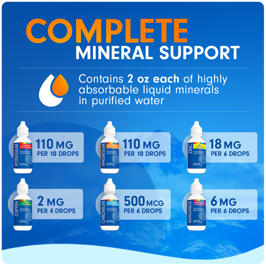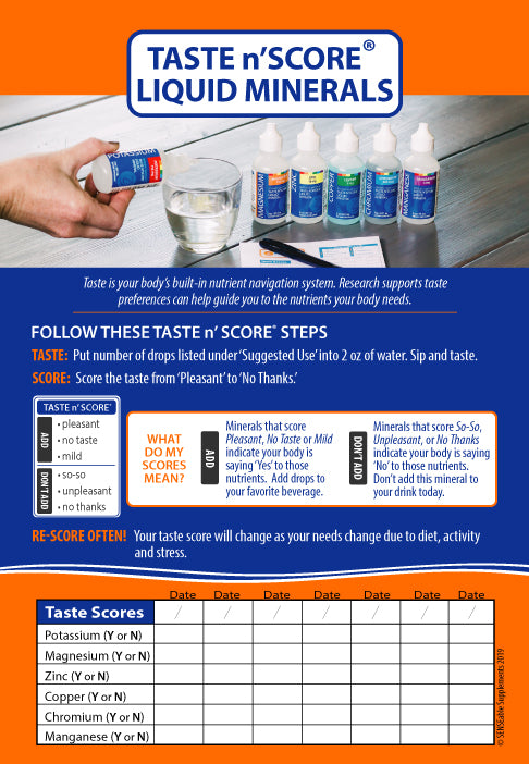 Taste n’ Score Mineral Kit contains highly absorbable liquid minerals considered essential to human health. Minerals support all metabolic processes including heart function, enzyme production, regulating body temperature, and glucose management. Taste n' Score Minerals are pure USP mineral salts...